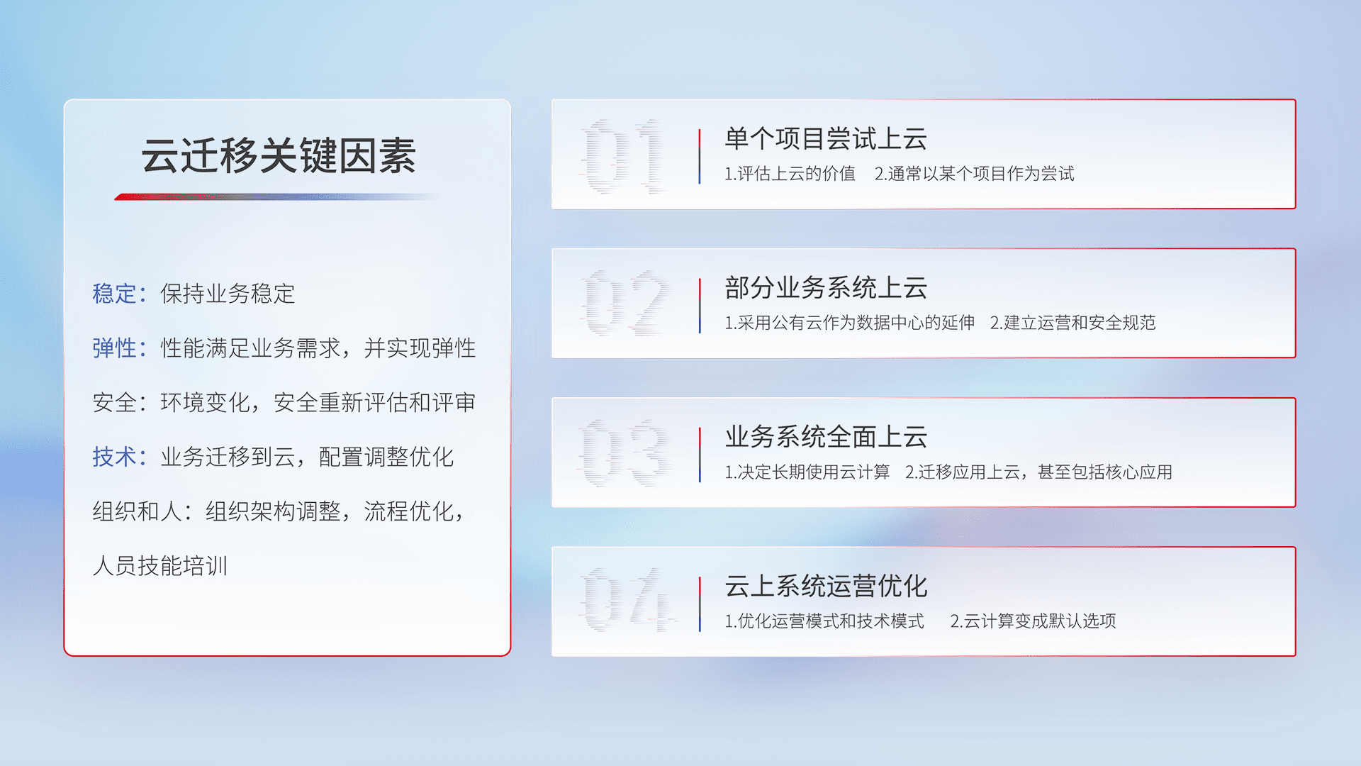 结合实际业务,,从规划设计、、、、云平台选型、、、、云原生改造、、、、数据迁移、、、、集成交付,,迁移全过程为客户识别最佳上云路径,,,,做好风险识别管理,,,设计网络架构、、、、身份权限、、、、安全审计合规、、、、操作审计、、日志审计、、、、监控告警策略、、多站点容灾设计等,,,,对云上基础设施进行整体规划,,,,提升IT治理水平,,,以满足弹性、、、、高可用、、、、高性能的需求。。。