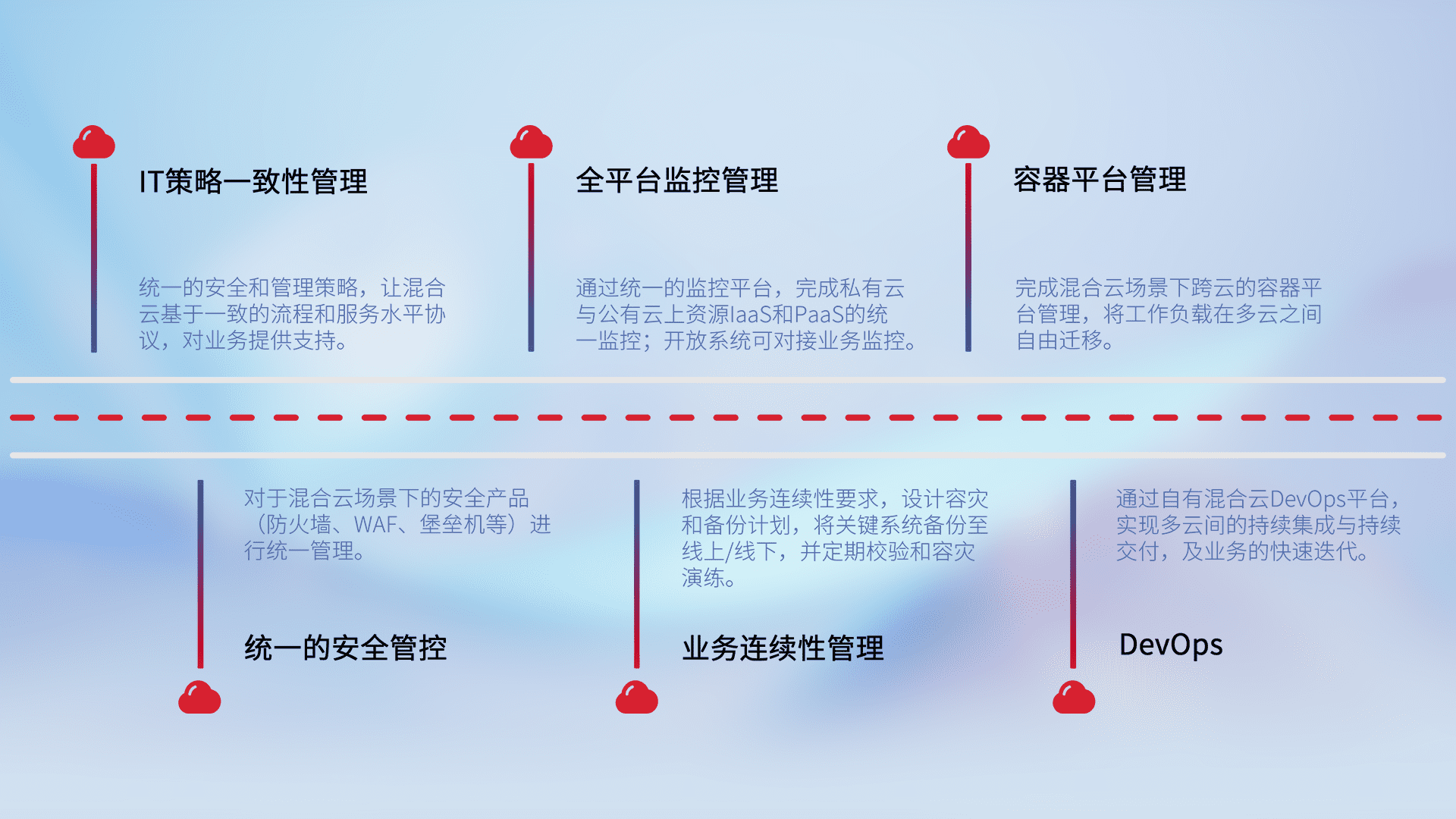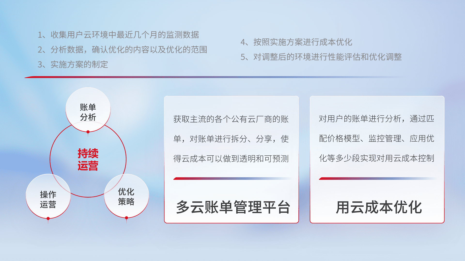 通过多云纳管,,以统一的资源数据模型把客户的云资源进行抽象和封装,,,进而实现对多云资源的统一操作,,,,保障云资源管理的可靠性、、、稳定性与可用性。。。量身定制化运维内容,,,配置、、、、开发运维、、补丁管理、、、备份、、、监控、、认证和访问管理、、审计和日常巡检等,,,保障在用云过程中的可靠度,,,稳定度以及高可用率。。。。